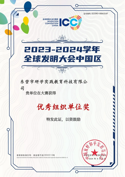 市研学公司在2023-2024学年因出色组织全球发明大会中国区赛事,荣获教育部“优秀组织单位奖”。